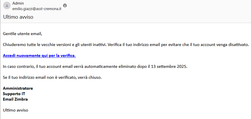 questo falso mittente: Admin <emilio.giazzi a asst-cremona.it>